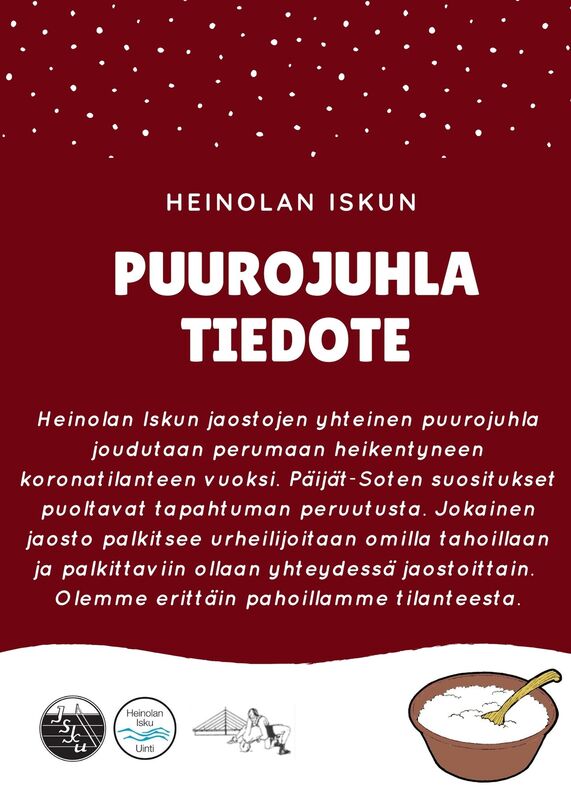 Heinolan Iskun jaostojen yhteinen puurojuhla peruuntuu heikentyneen koronatilanteen vuoksi. Uintijaosto järjestää oman pienen palkintotilaisuuden, josta informoidaan myöhemmin. Mikäli pääseura palkitsee uimareita, tulee heiltä erillinen kutsu palkittaville WPK talolle maanantaina 29.11. klo 18.00. |